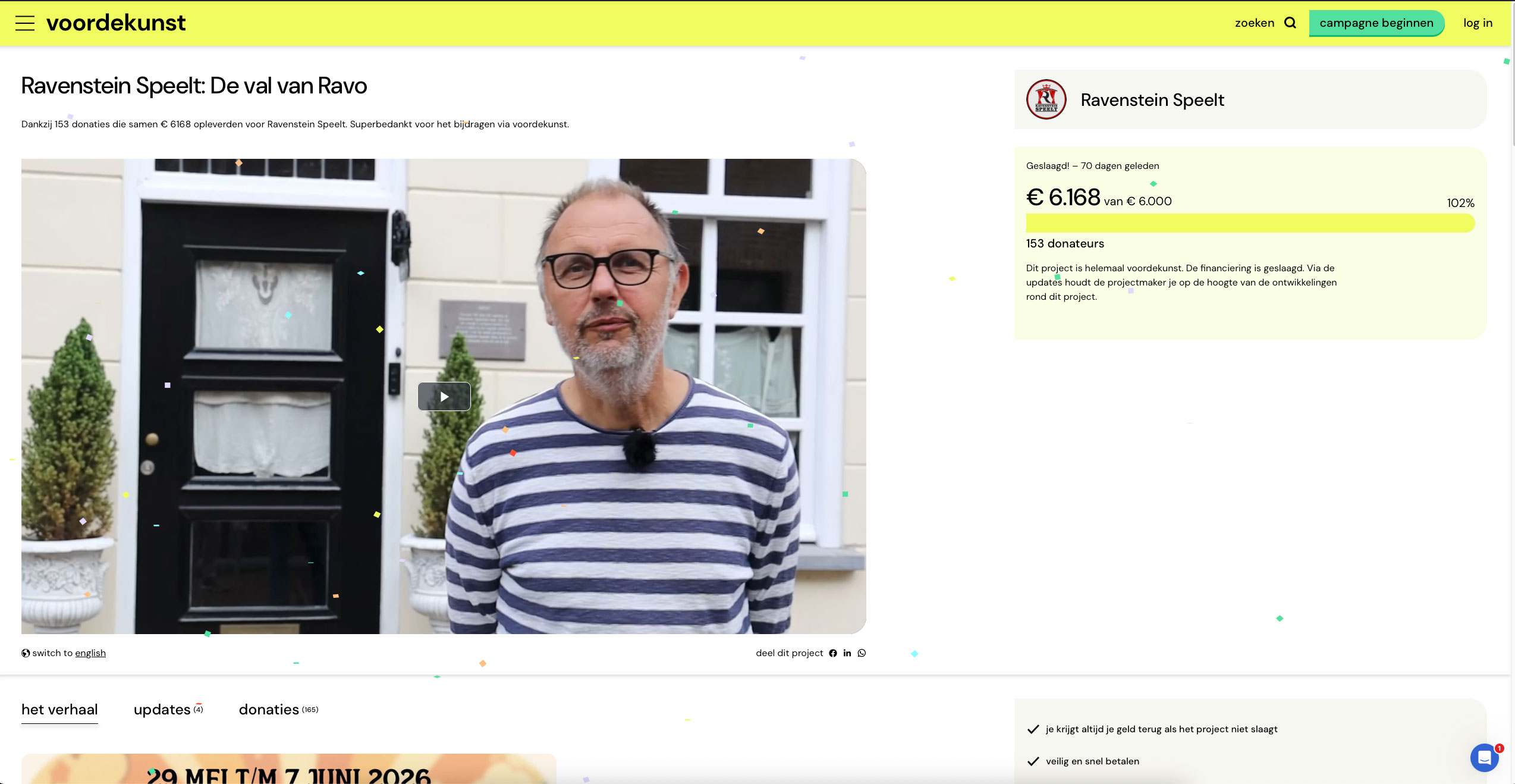 De Crowdfundingsactie van Stichting Ravenstein Speelt is een groot succes! Iedreen die hieraan een steentje heeft bijgedragen heel erg bedankt. Het geeft ons ook het vertrouwen dat we een mooie voorstelling kunnen neerzetten.
